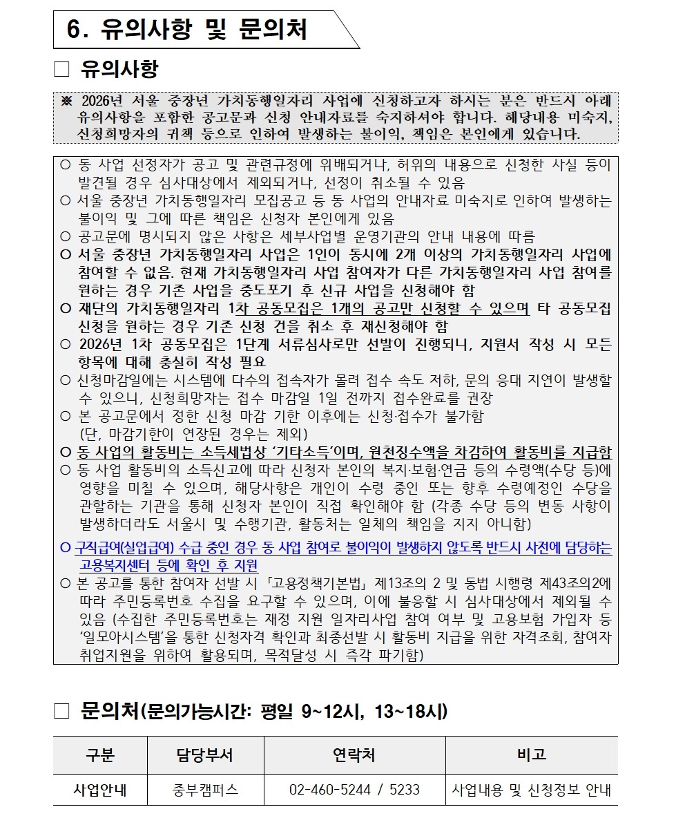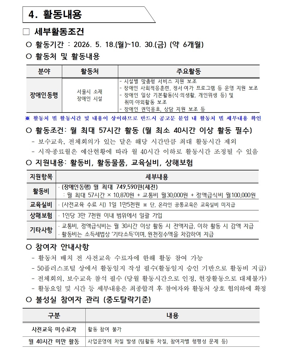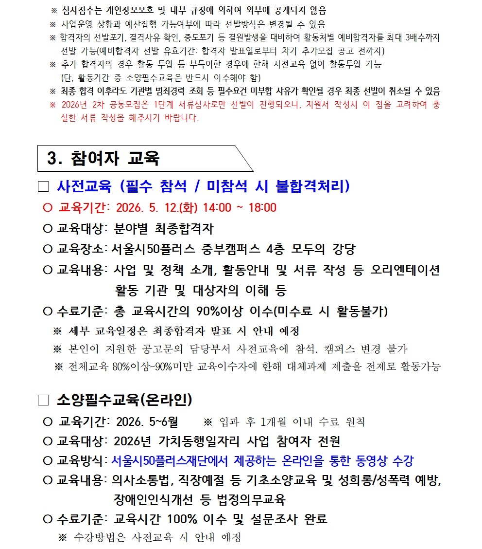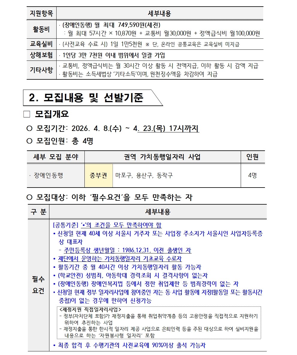 • 40세 이상(차상위 계층도 동일)인 자 중 주민등록상 서울시 거주자 또는 사업장 주소지가 서울시인 사업자등록증 상 대표자 • 월 활동시간(57시간) 중 70%(40시간)이상 활동이 가능한 자 • 모집공고 최종합격 후 참여자 사전교육 수료(90% 이상), 소양필수교육 수료(100%) 가능한 자 • 모집공고 마감일 전까지 재단에서 운영하는 가치동행일자리 기초교육 수료한 자