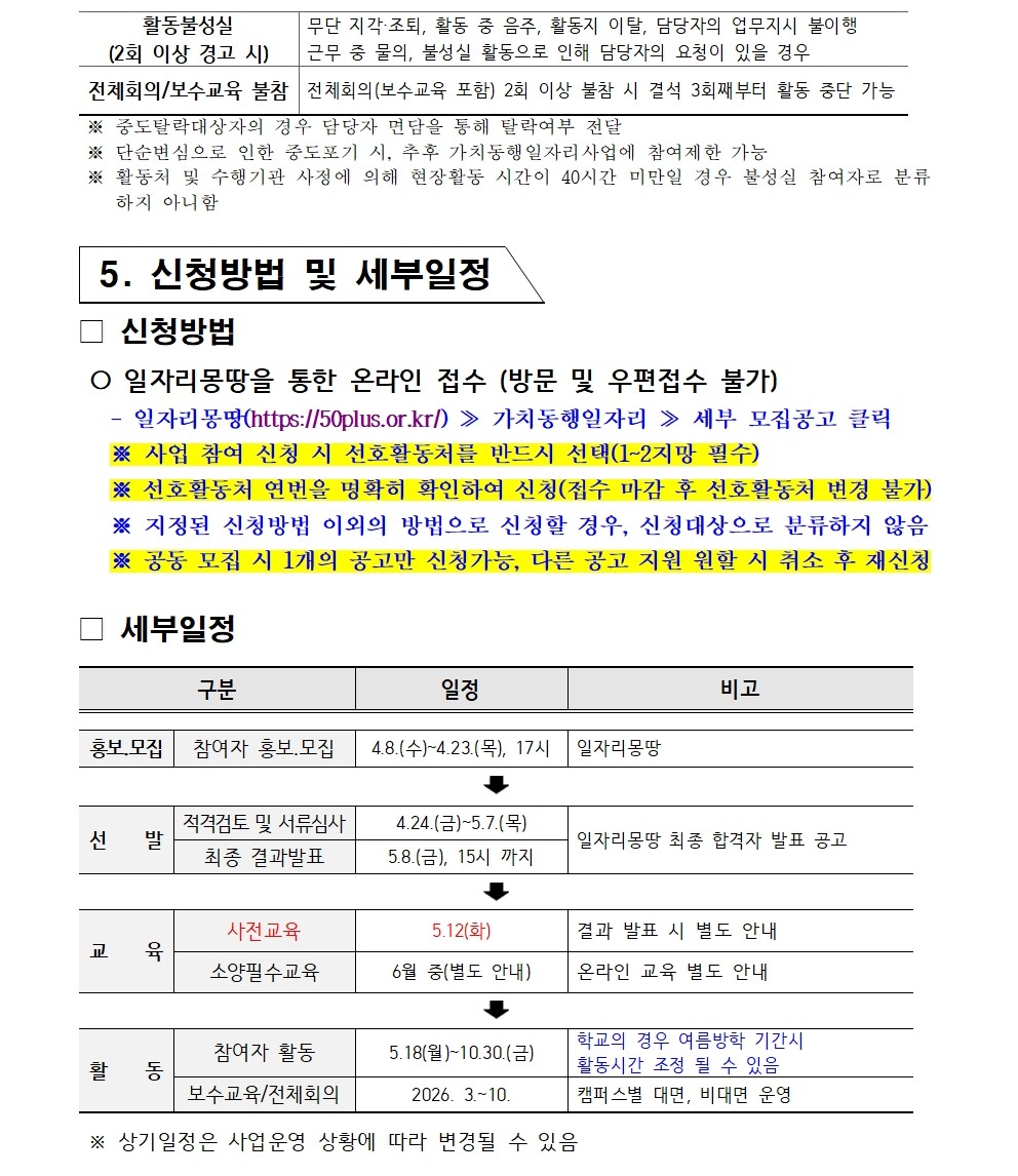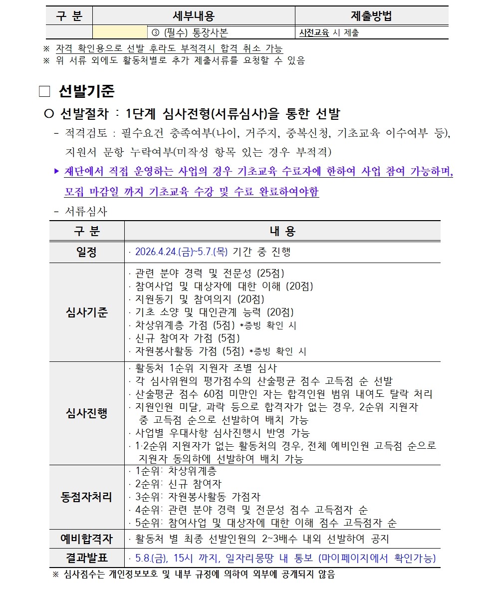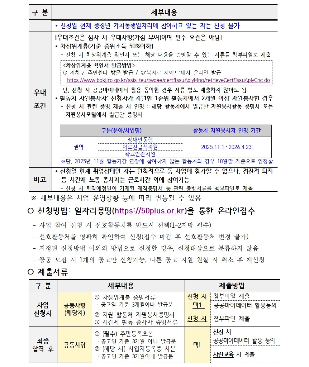 1) 신규 사업참여자 2) 활동처 자원봉사자: 신청자가 지원한 1순위 활동처에서 2025년 11월 1일~2026년 4월 23일 사이 2개월 이상 자원봉사 이력이 있는 자 3) 차상위계층(기준 중위소득 50%이하)인 자 ※ 1~3번 사항의 우대조건은 심사 시 우대사항이며, 필수요건은 아님 ※ 2~3번 사항은 온라인 신청 시 증빙서류 첨부 필수, 증빙서류 미첨부 시 가점 미부여