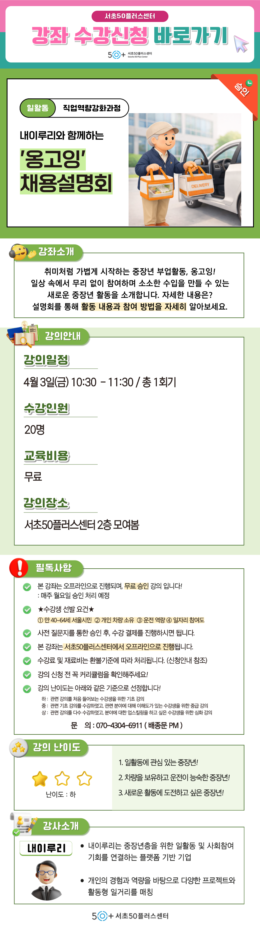 모여봄 서초50플러스센터 옹고잉 사업 소개 - 중장년 배달 일자리 ‘옹고잉’ 사업 개요 - 사업 목적 및 활동 특징 안내 활동 내용 안내 - 실제 배달 활동 방식 및 업무 흐름 - 활동 시간 및 활동 환경 소개 참여 조건 및 활동 혜택 안내 - 참여 대상 및 신청 자격 - 활동 수당 및 활동 방식 안내 지원 방법 및 향후 일정 안내 - 신청 절차 및 선발 과정 설명 - 향후 교육 및 활동 일정 안내 질의응답 및 상담 - 참여 관련 궁금증 해소 필기도구