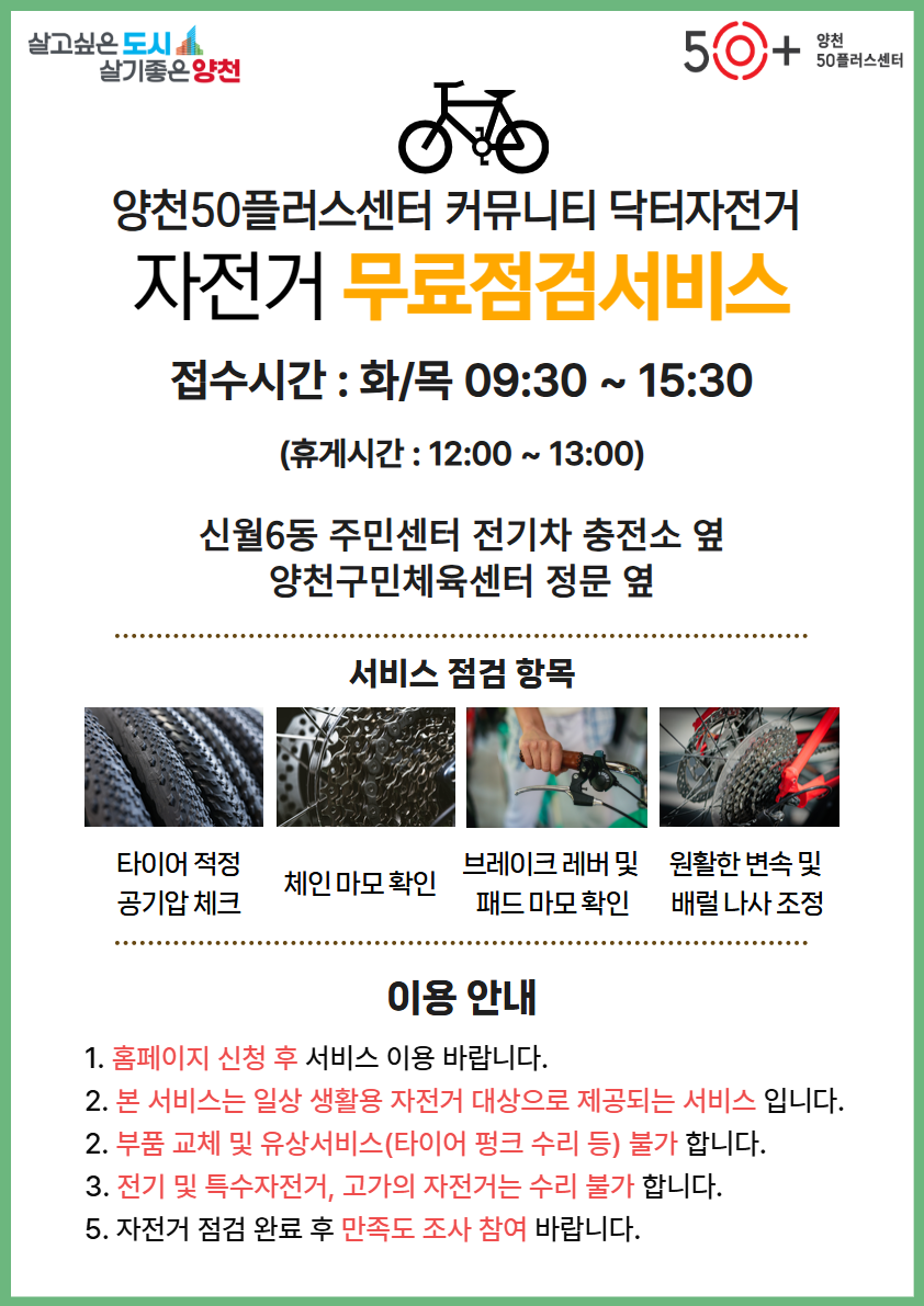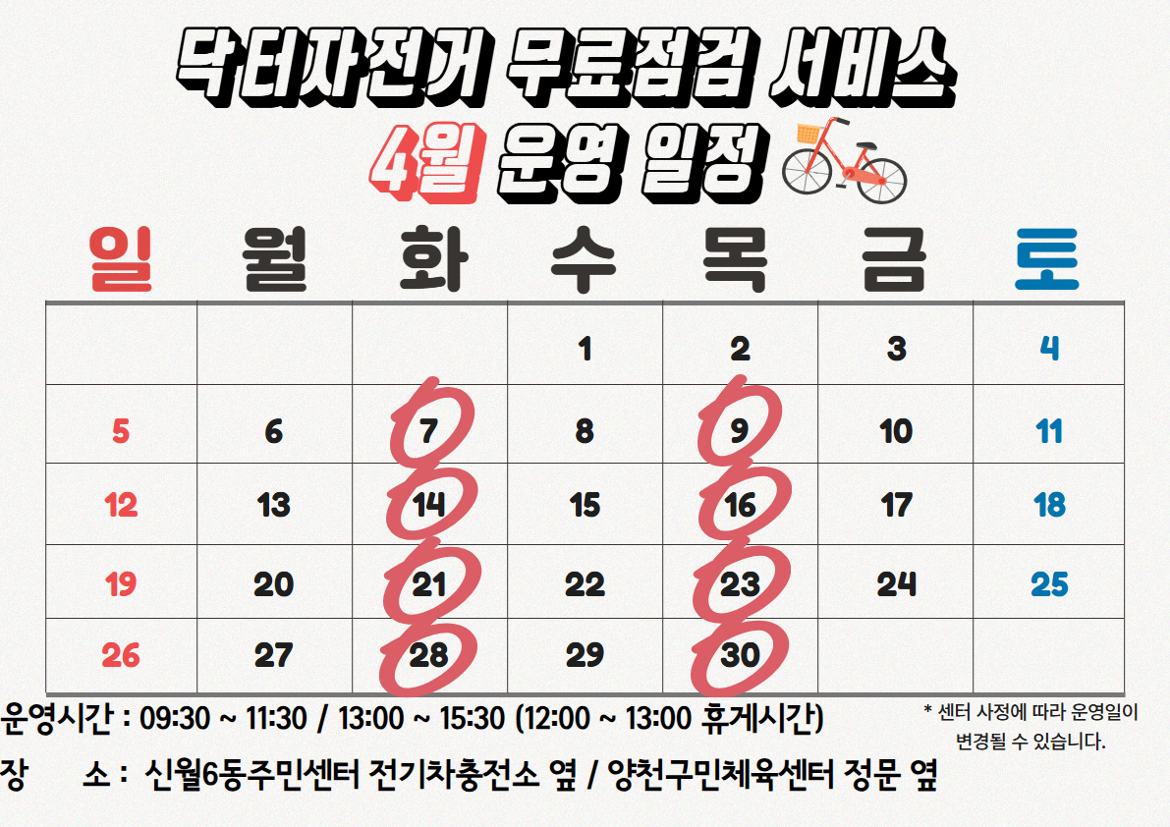 신월6동 주민센터 전기차 충전소 옆 / 양천구민체육센터 정문 옆 닥터자전거 전문커뮤니티 2026 화,목 9시30분~15시30분 *전기자전거, 산악자전거 등 특수자전거 제외 *타이어펑크, 부품 교체 등 유상서비스 불가 *사전접수 후 이용가능 점검 자전거