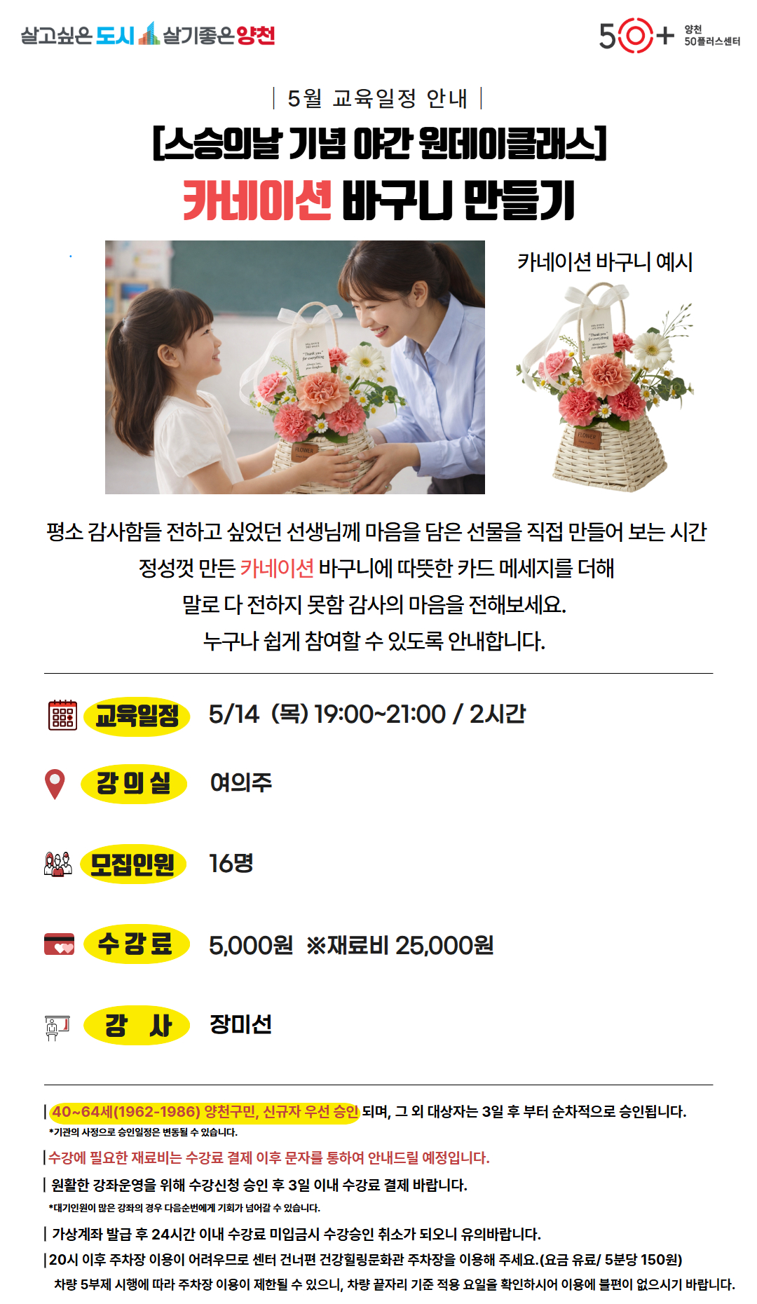 [양천][스승의날 기념] 카네이션 꽃바구니 만들기 원데이클래스마감 D-21