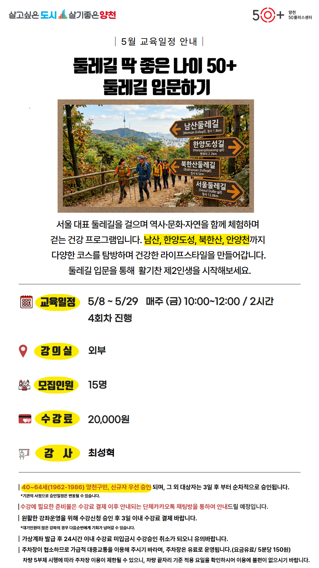 [양천]둘레길 딱 좋은 나이 50+, 둘레길 입문하기마감 D-20
