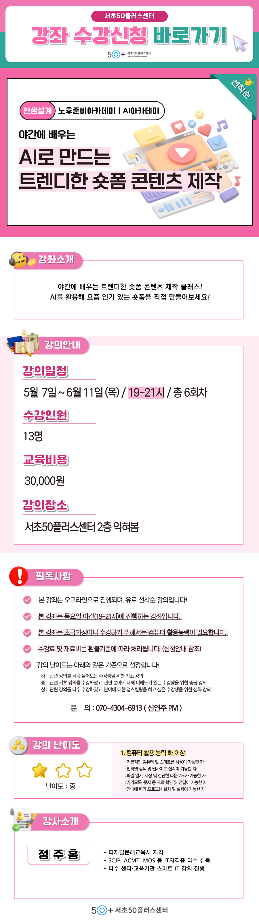 [서초][AI아카데미] 야간에 배우는 AI로 만드는 트렌디한 숏폼 콘텐츠 제작마감 D-15