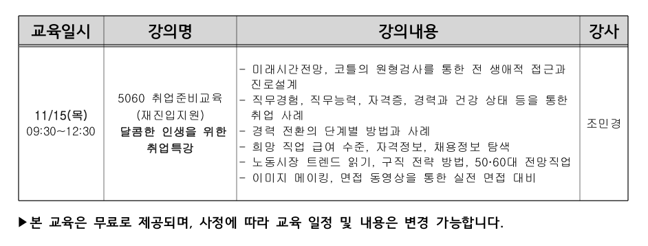 서울일자리센터는 11월 15일(목) 9시 반~12시 반, 만 50~64세 취업 희망자를 대상으로 무료 취업 준비교육을 시행합니다.