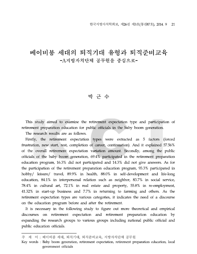 이 연구는 베이비붐 세대 지방자치단체 공무원을 대상으로 그들이 생각하고 있는 퇴직에 대한 기대 유형과 퇴직준비 교육 참여 여부 및 선호도를 조사함.