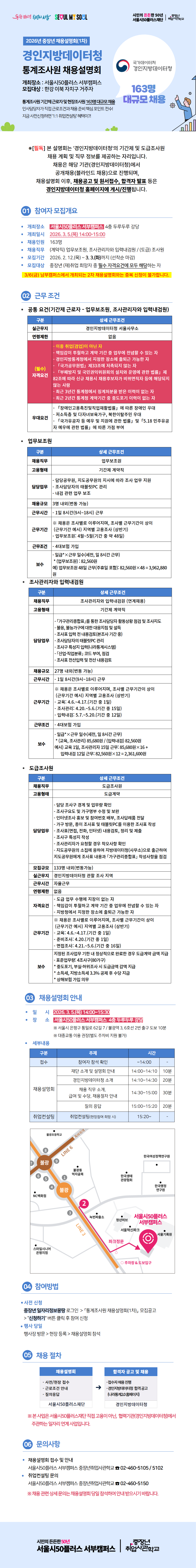 국가통계 생산 분야 근무를 희망하는 중장년을 대상으로 기간제근로자 및 도급조사원 직무와 채용 및 선발과 관련된 정보 제공