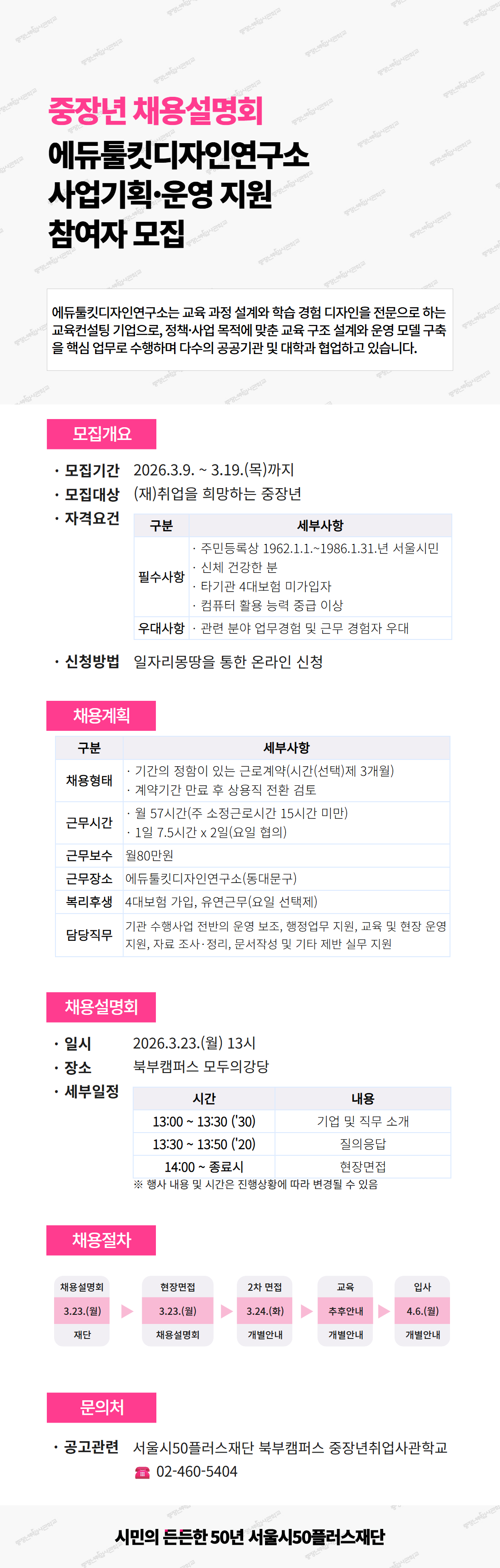 2026년 중장년 채용설명회 「에듀툴킷디자인연구소 사업기획·운영 지원」참여자 모집마감 D-10