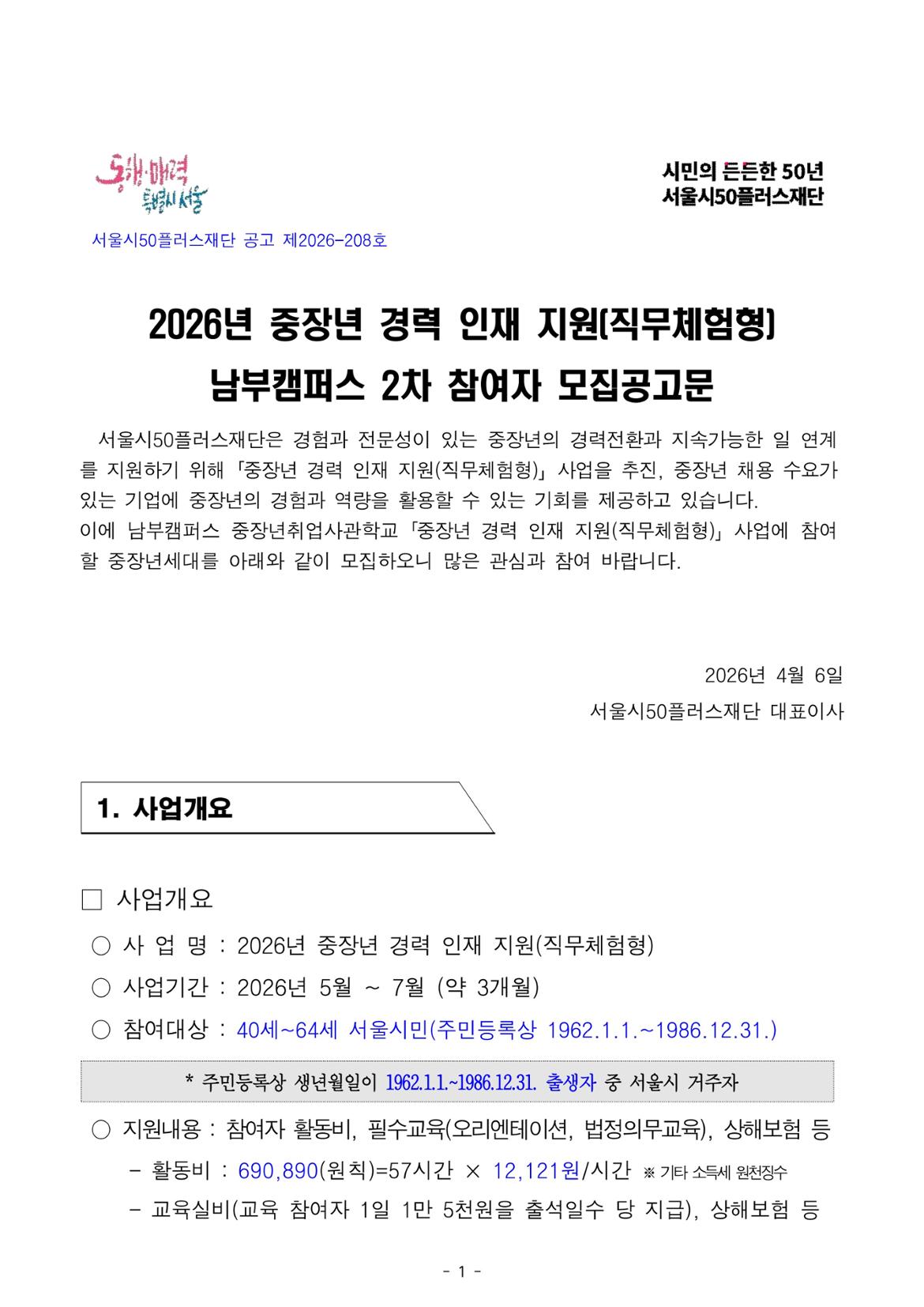 [남부]중장년 경력 인재 지원(직무체험형) 2차 참여자 모집마감 D-8
