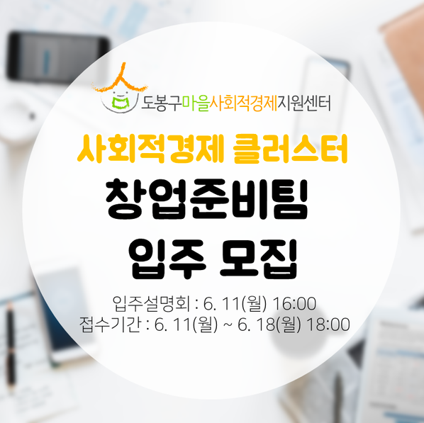 도봉구 마을사회적경제지원센터가 6월 11일(월)부터 6월 18일(월)까지 도봉구 사회적경제 클러스터에 입주할 창업 준비팀을 모집합니다.