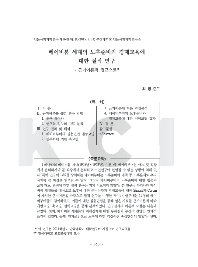 베이비붐 세대의 노후 준비상황과 경제교육 요구를 파악하기 위해 근거이론을 바탕으로 질적 연구를 수행함. 17명의 베이비붐 세대를 대상으로 한 심층면접 자료를 근거이론에 따라 개방코딩, 축코딩, 선택코딩으로 분석함.