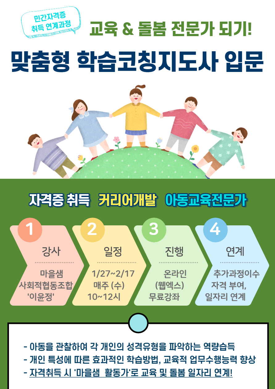 - 마을샘 사회적협동조합 '돌봄교사 및 교육교사'로  활동하는 일자리 연계 가능
